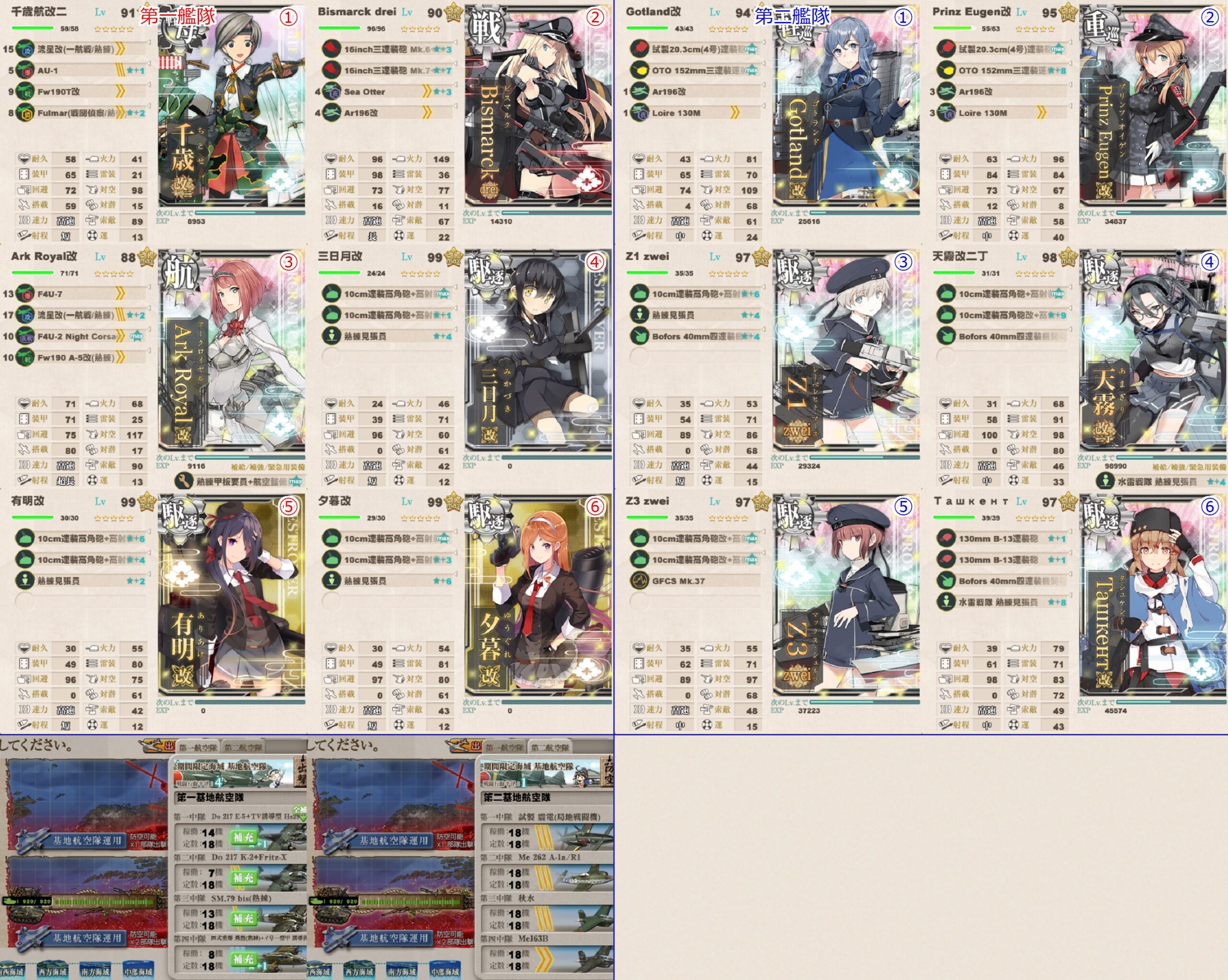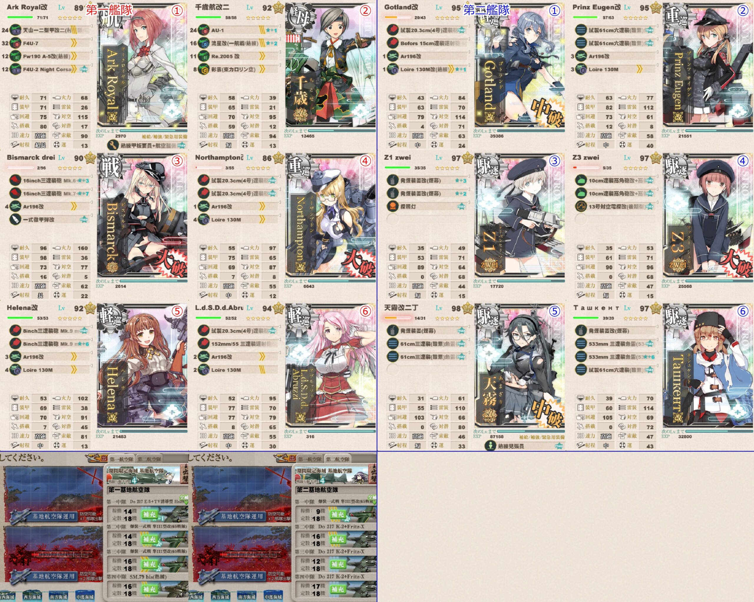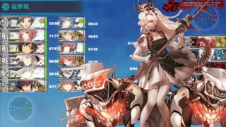 基地はボスへ、支援はフル、煙幕はボス前です。ラスダン8回出撃、4回到達でした。ボス前は第二で行くとちょっと通りやすいような?さて空母3隻だと駆逐艦が5隻必要だそうです。さらに戦艦をもう1隻増やせばプリンが入れられないようなので諦めました。この編制は1回しか試してませんがT字有利を呼び込みゴトのひょろ魚雷でキメてくれました。予定では空母が大暴れしてくれるはずでしたがまぁまぁでした。それよりも徹甲弾を降ろしたビスが大暴れで敵2番艦・3番艦を確殺してくれたのはグッジョブでした。ちなみに潜水艦はラスダン編制のボス陣営の攻撃を吸い込む役です。潜水艦もグッジョブ。