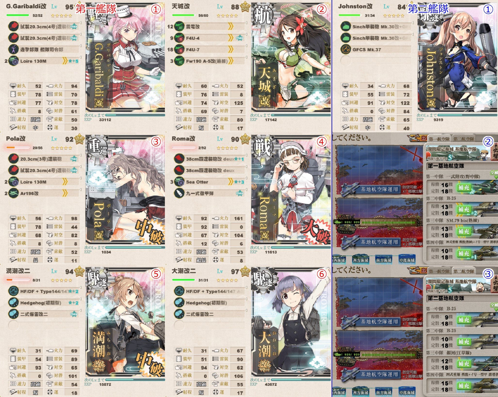 ABDKLMルートです。基地はボスとボス前へ、支援は基本無し、ラスダンだけ決戦、陣形は警戒・警戒・輪形・警戒・ボス単縦陣です。今更ですが天城が全く活躍してなかったので艦攻載せて基地第一に陸戦1を入れた方がいいです。満潮と大潮はE2-3開放SマスS勝利x1で対地戦があるので今のうちに採用です。サブ艦は全部です。
