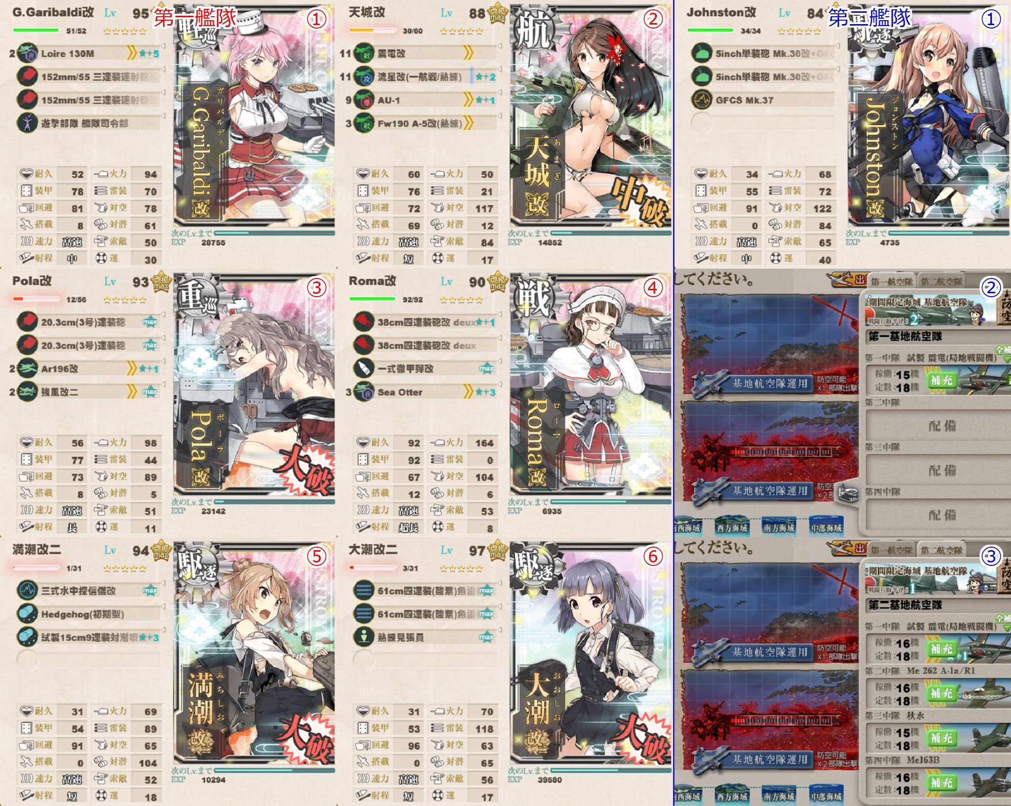 AFIJRルートです。基地は防空、支援は無し。道中がちょっと不安でしたがポーラの中破だけで到達できました。ついでに防空もしていましたが画面を見てなかったので確認できず。補給があったので来てたはずです。