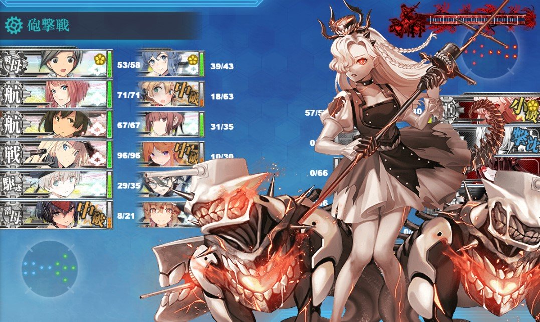 空母3隻で第2ボスへ行けます。3隻目はバイト艦の加賀です。基地はOマスとVマスへ、支援は無し、煙幕はVマスです。1周目は簡単にA勝利が取れましたが2周目からは道中大破が続いたので、結局道中支援を出した方が効率がいいです。特にVマスが鬼門です。