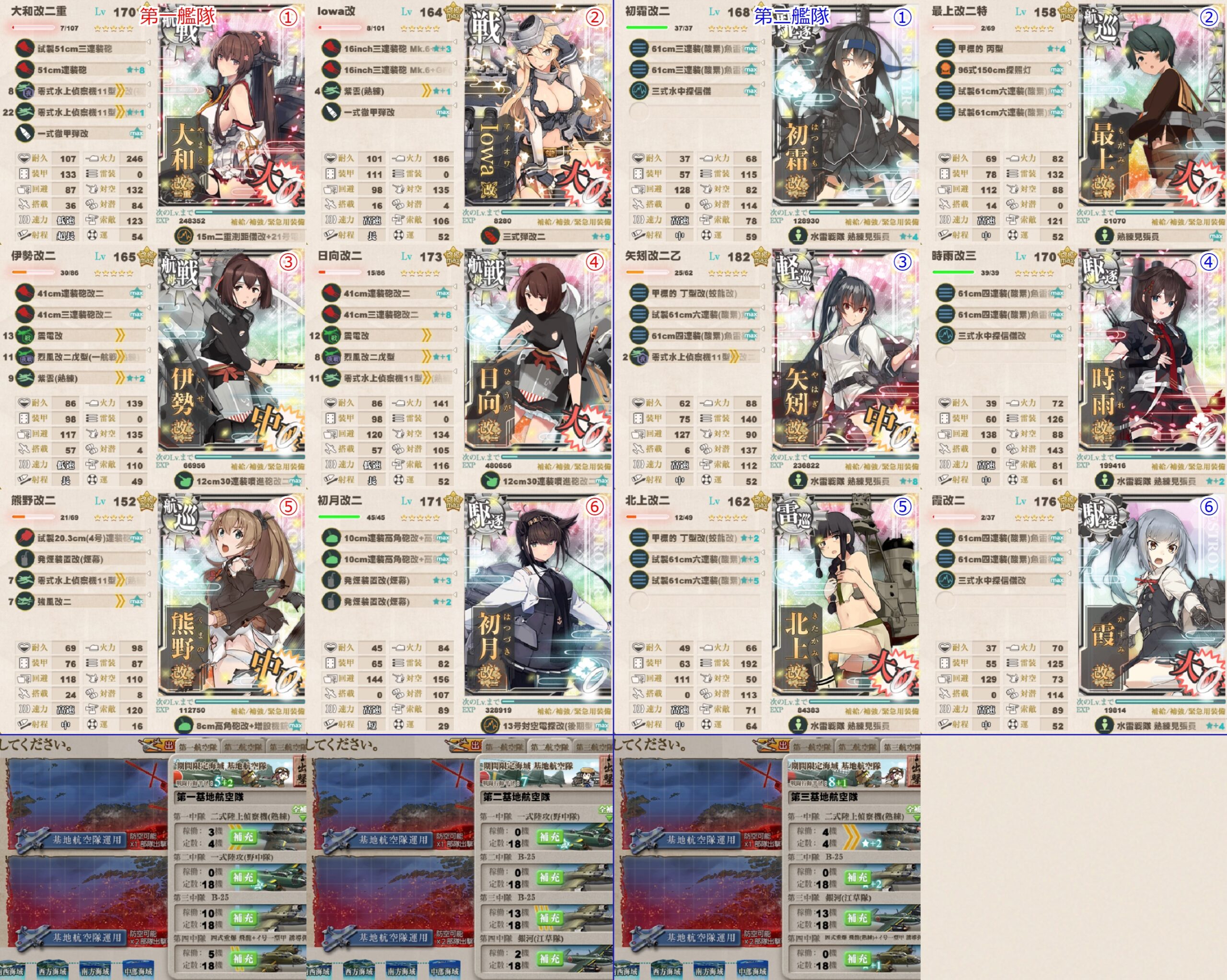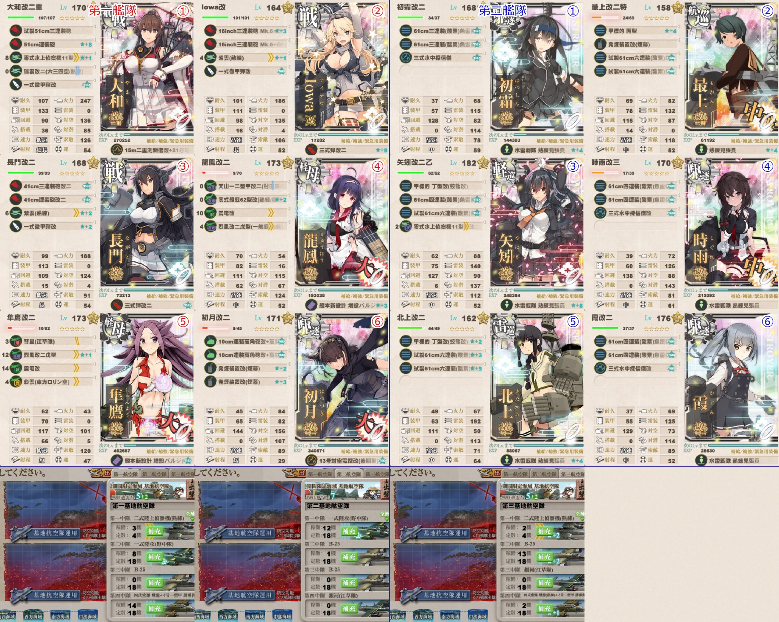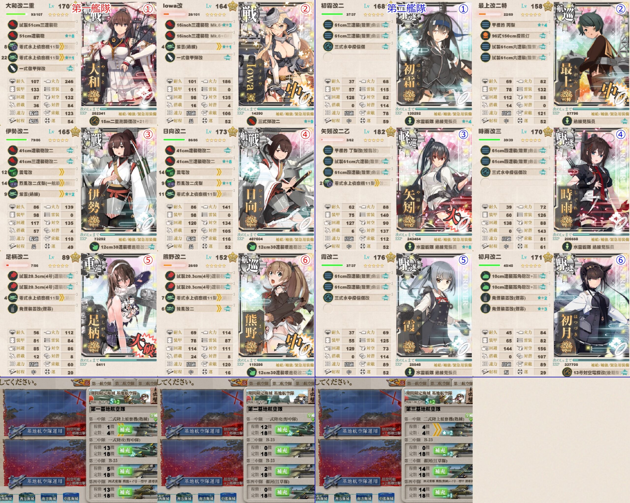 基地はボスへ、支援は前衛砲撃と決戦支援、煙幕はIマス、陣形は対潜・輪形・煙幕第二・第二・ボス第四です。最上に探照灯か煙幕かで迷走しましたが煙幕は3個必要です。軽空母は道中安定に寄与するしボス戦でも撃てれば100ダメくらい稼げるのですが、中破や枯れたりで安定性に欠けました。まぁボスマスにたどり着ければそれでヨシではある。