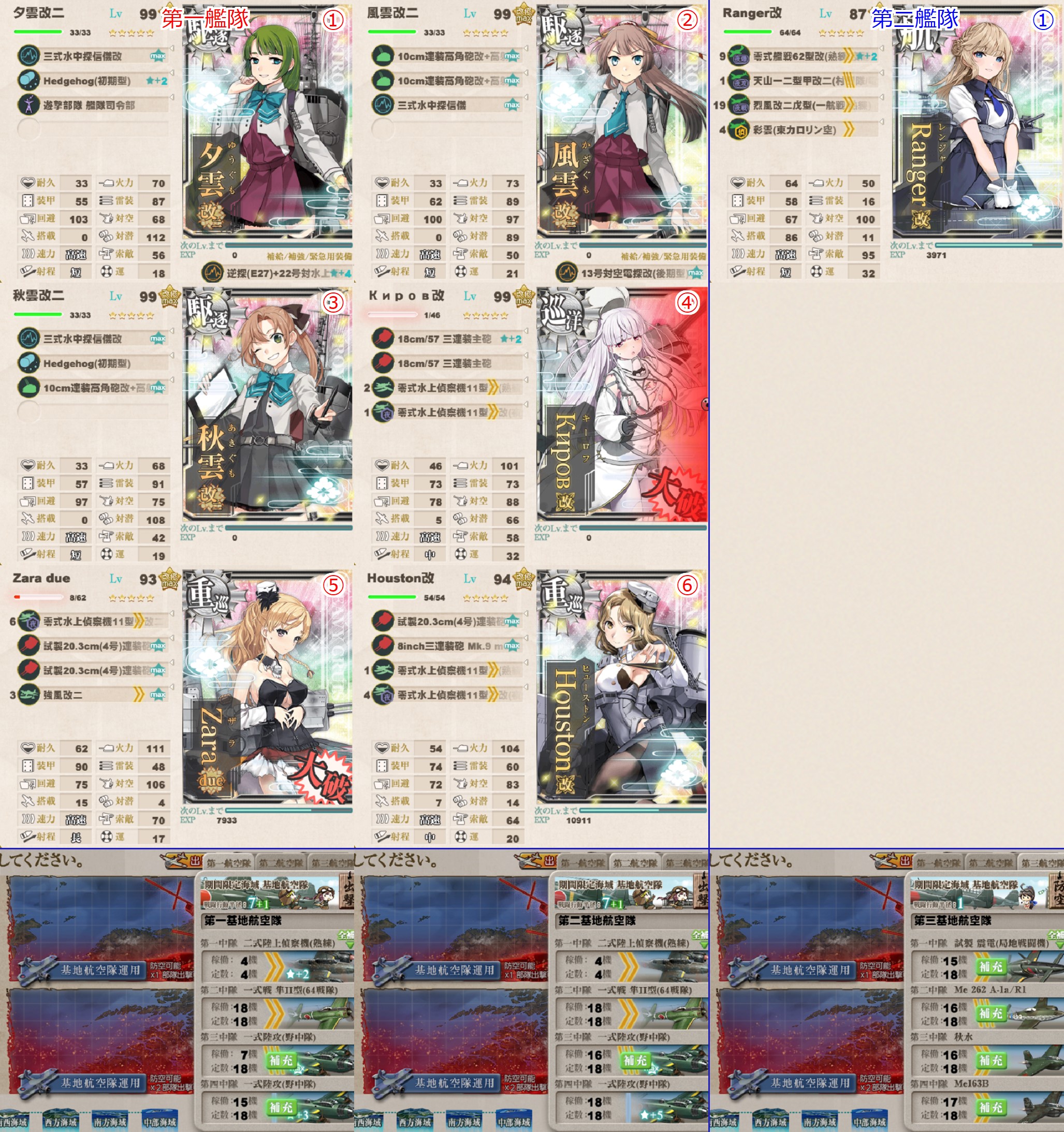 基地はC2マスとDマスと防空、支援は無し、陣形は警戒・輪形・輪形・警戒・警戒・単縦陣です。1部隊防空で優勢が取れていました。C2マスは軽巡ム級がいるので大破になりますが、1周目はキーロフ大破、2周目はザラ大破で通れました。サブ艦はザラ・ヒューストン・レンジャーです。横須賀防備戦隊札が付きますがギミック専用らしいです。