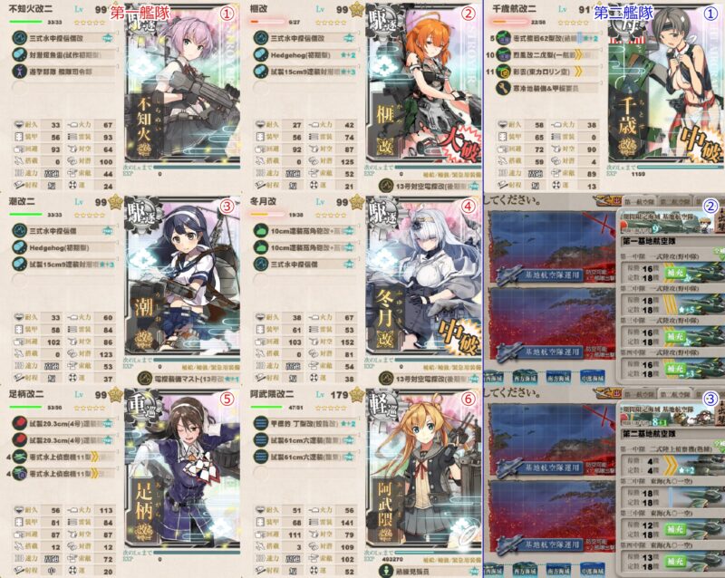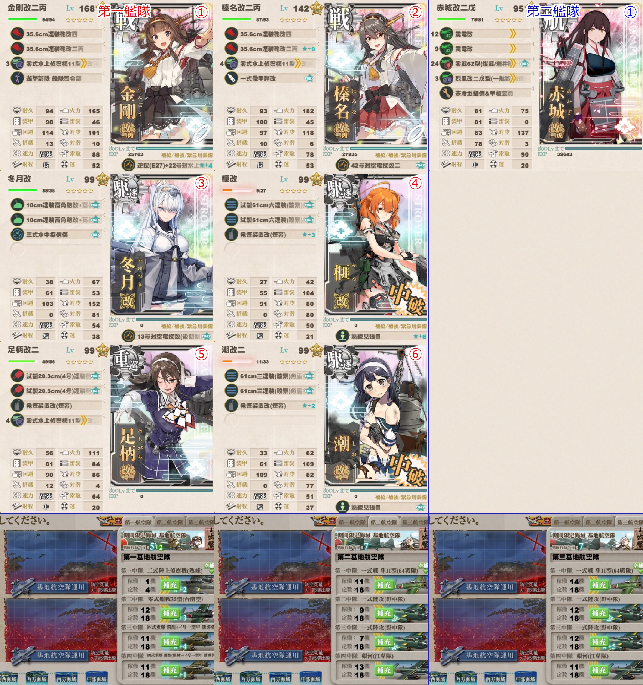 基地は3部隊ボス集中、支援はラスダンだけ決戦支援、煙幕はボス前、陣形は警戒・警戒・輪形・煙幕警戒・ボス単縦陣です。ボスで制空が拮抗になりますがほぼ勝てます。金剛榛名はメイン、赤城はサブです。