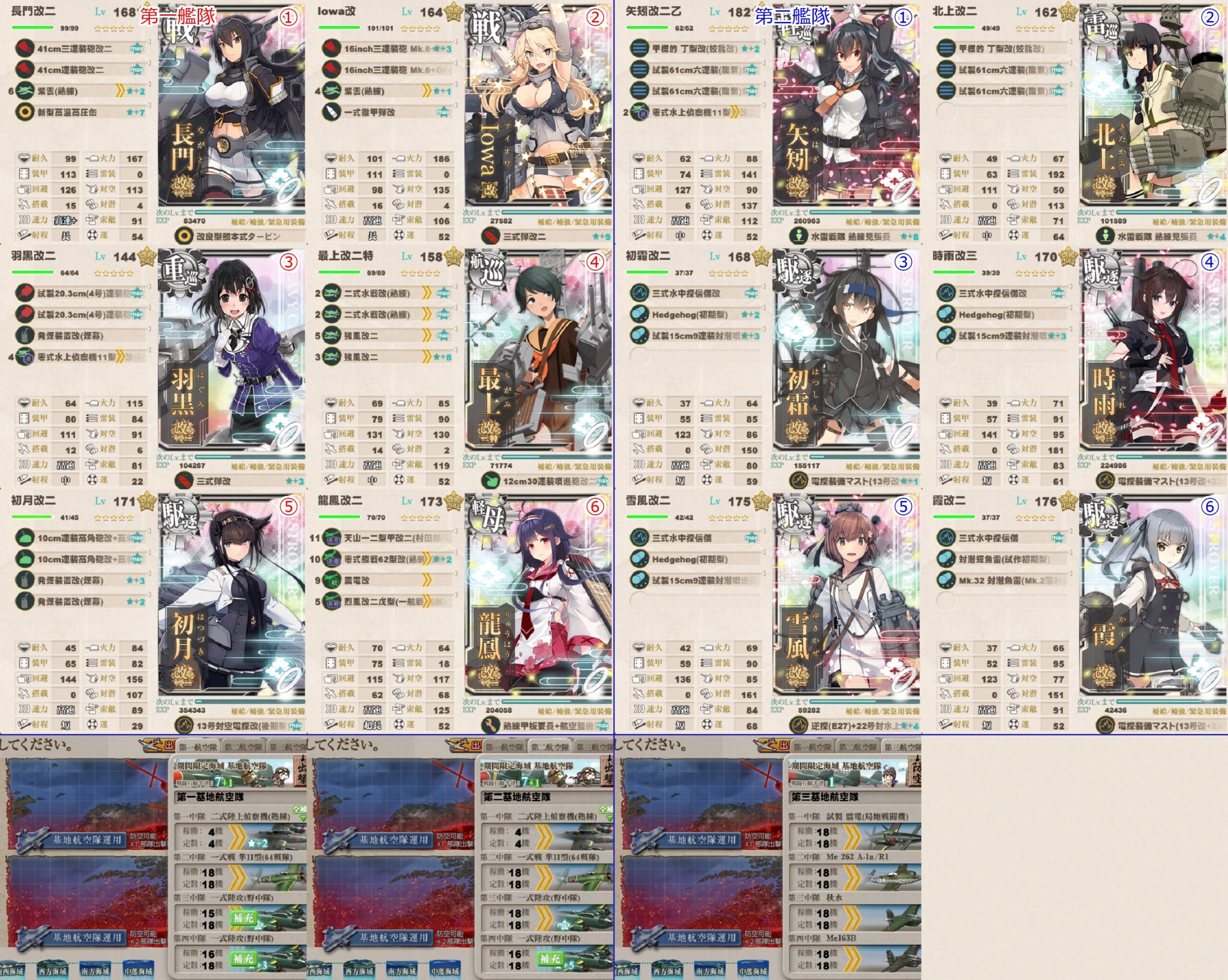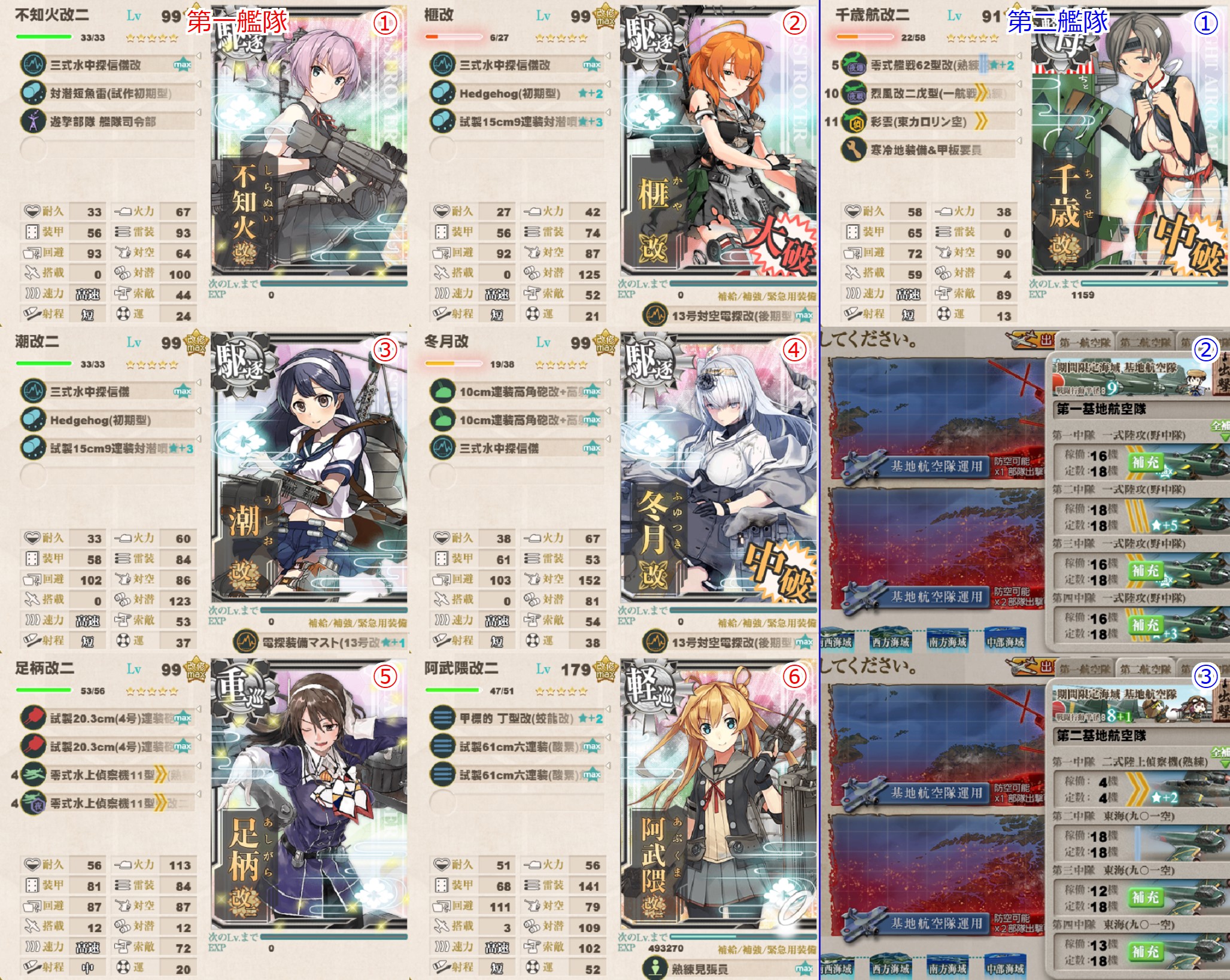 高速以上、空母に寒冷地装備&甲板要員を積むと第百四戦隊札が付きます。基地はボス前陸甲とボス東海、支援は無し、陣形は輪形・警戒・警戒・ボス警戒です。ボスは潜水艦なので苦労することなく狩れました。